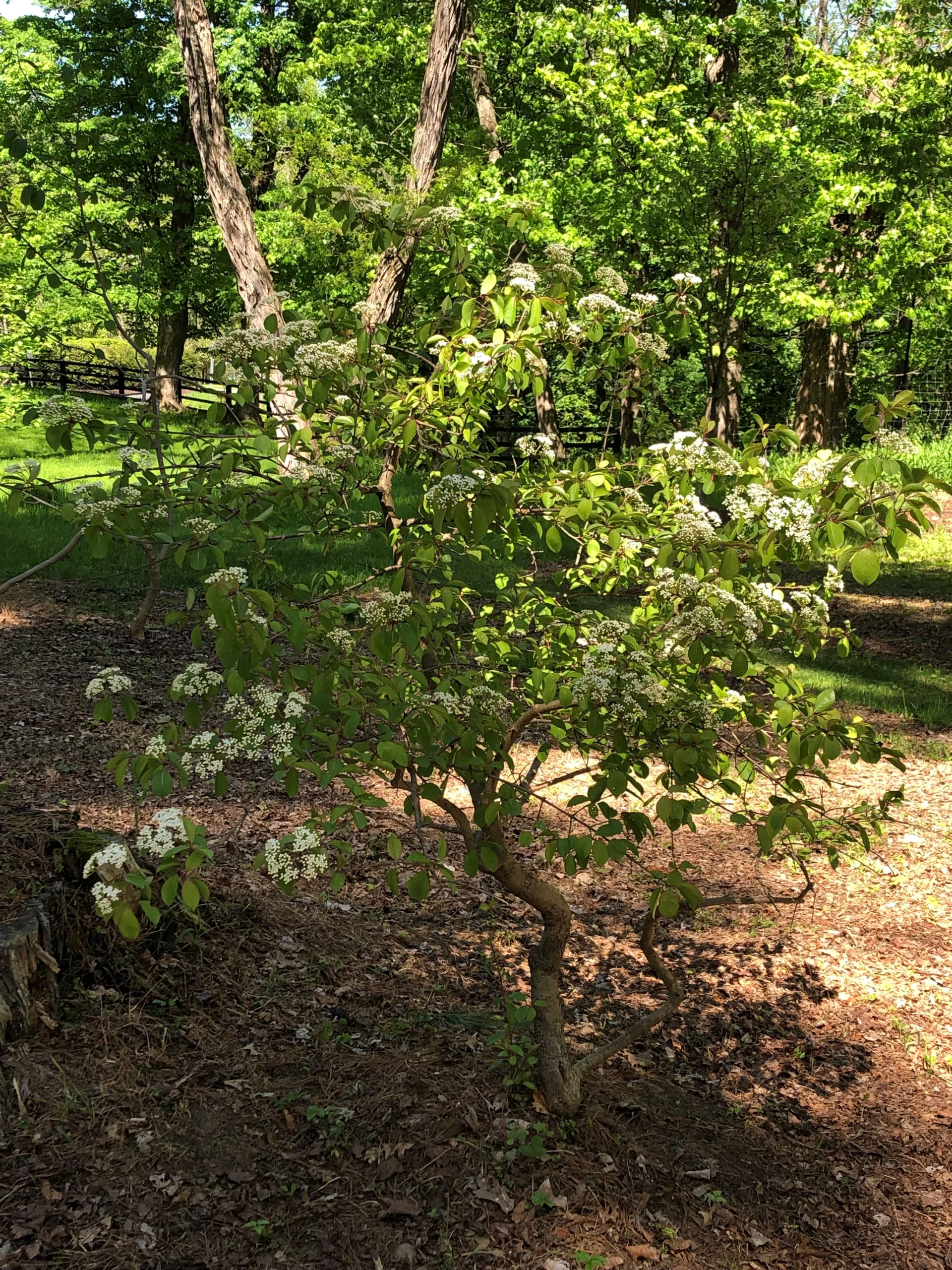 Blackhaw viburnum (Viburnum prunifolium) is a large, deciduous shrub or small tree recognized for its upright form, finely toothed, plum-like leaves, and flat-topped clusters of creamy white flowers in spring. By fall, it produces blue-black drupes high in fat content, an important food source for migratory birds. The foliage develops deep red to purple tones in autumn. It is tolerant of drought, clay soils, and partial shade, making it a reliable, wildlife-friendly choice for ecologically informed plantings.