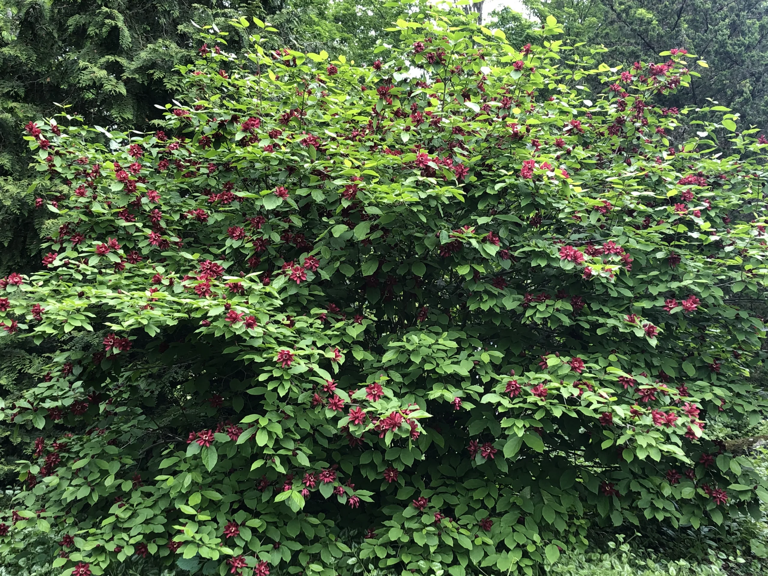 A hybrid between eastern sweetshrub (Calycanthus floridus) and Chinese wax shrub (Sinocalycanthus chinensis), ‘Hartlage Wine’ is a modern ornamental selection known for its large, wine-red flowers with subtle cream centers. Unlike its parents, this cultivar boasts significantly larger blooms and a longer flowering period, often reblooming lightly into summer. The flowers have a mild fragrance and emerge on current season’s wood, making it easy to maintain with spring pruning.