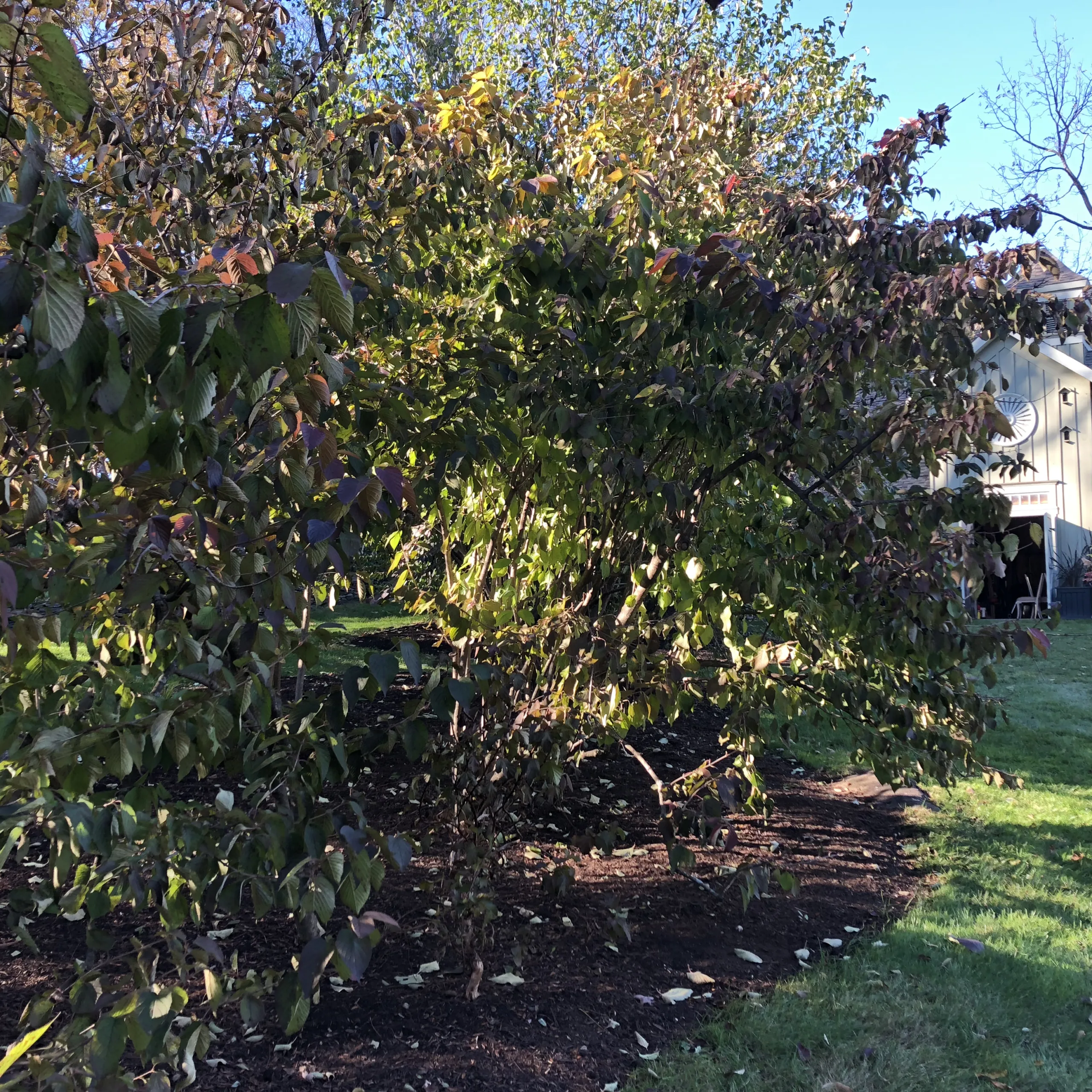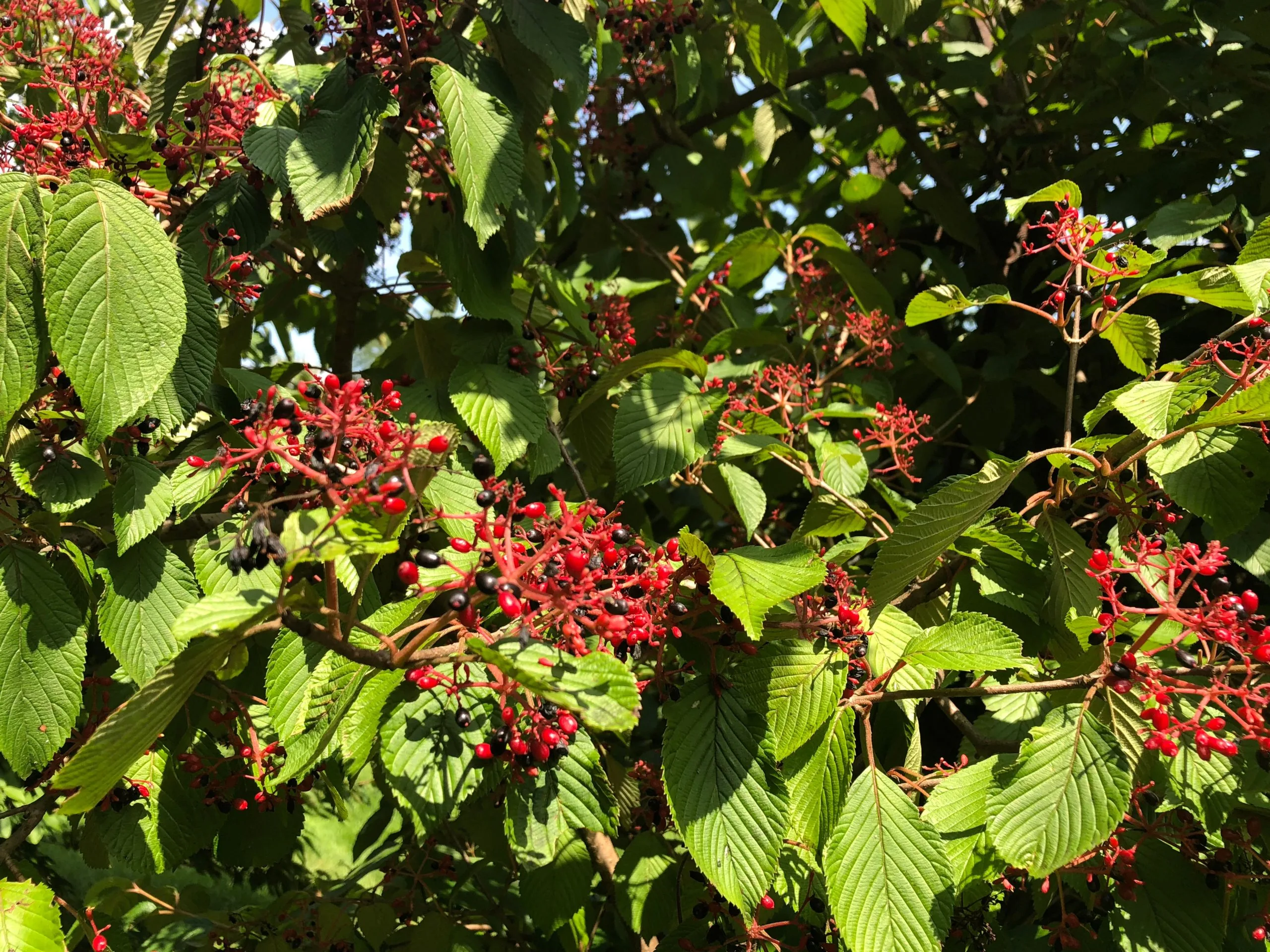 Doublefile viburnum is a deciduous shrub admired for its striking horizontal branching and flat-topped clusters of white flowers that bloom in parallel “double file” rows along the stems. Following bloom, red berries ripen to black and are eaten by birds. This structural shrub offers year-round interest with layered form, deep green foliage that turns reddish-purple in fall, and a graceful, arching silhouette that complements woodland edges or open borders.