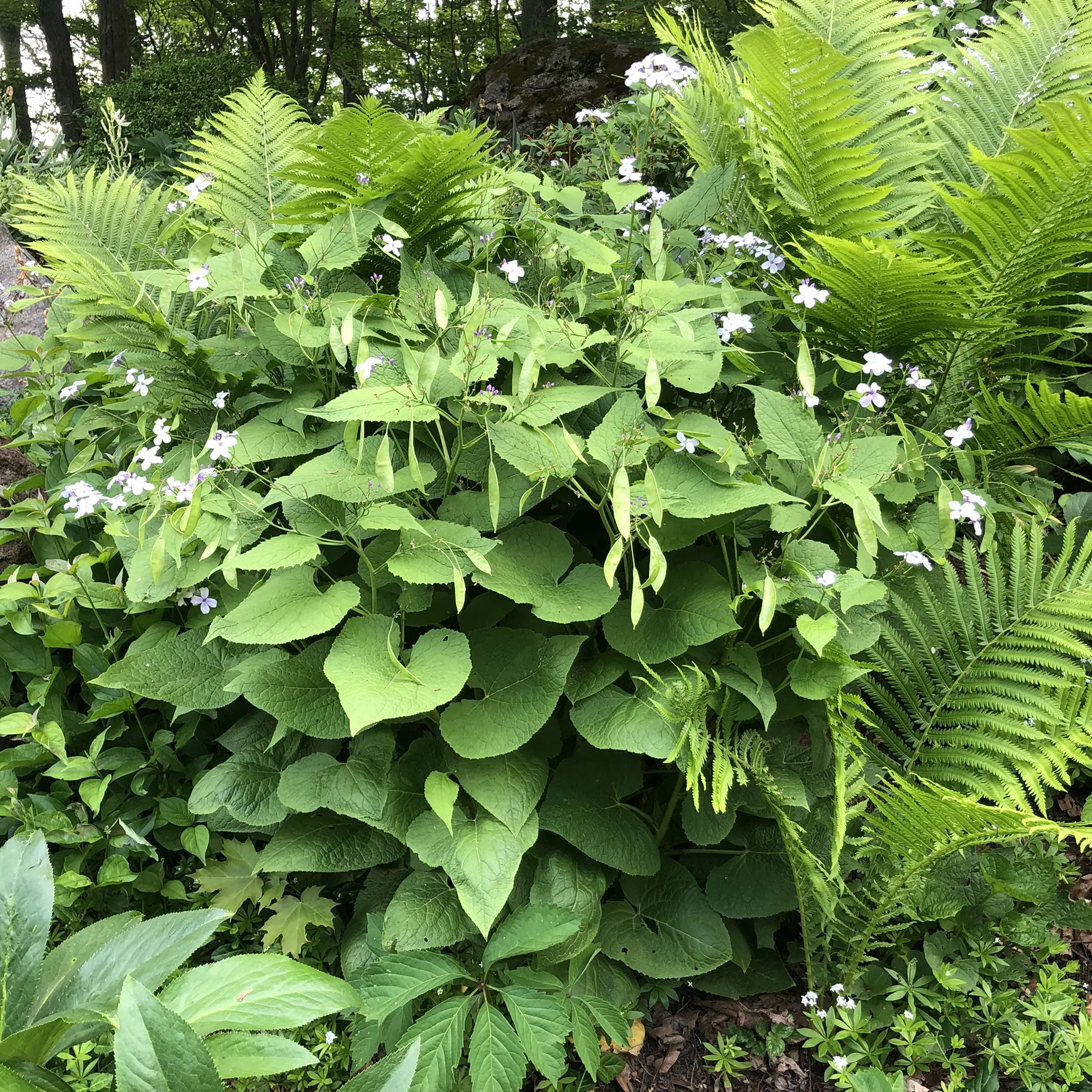 The narrow, elliptical seed pods that follow are translucent and slightly twisted, lending ornamental value well into late summer. Although slower to establish than the annual species, Lunaria rediviva offers a quieter, more naturalistic presence in shade gardens and self-sows modestly once it is settled.